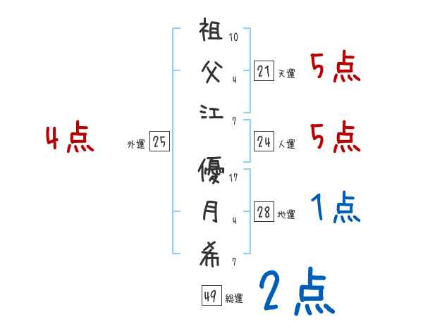 天運![]() | 祖父江優月希さんの天運は21画の5つ星!統率力がある。独立し成功する。名誉を手に入れる。 家系が持つ宿命的な運勢を表します。祖先から受け継いだ苗字ですので自分の力が及びません。家柄を象徴します。 |