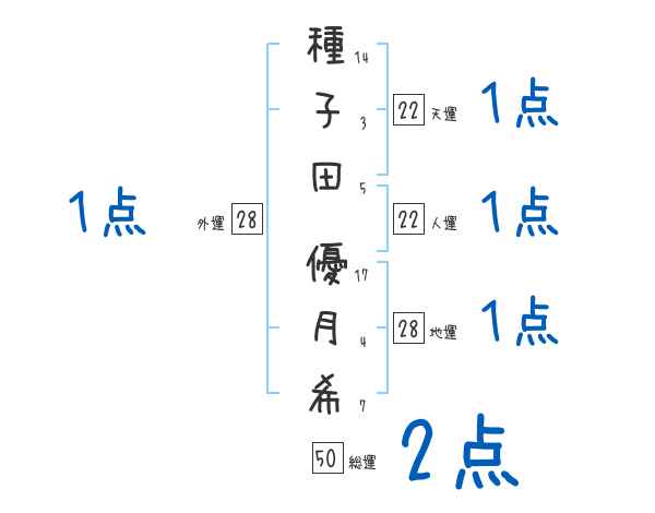外運![]() | 種子田優月希さんの外運は28画の1つ星!家庭環境に注意。スポーツで活躍できる能力があるかも。 生活面を象徴する運勢です。外部から受ける影響力を表し、結婚運、家庭運や職場、環境への順応性を表します。 |