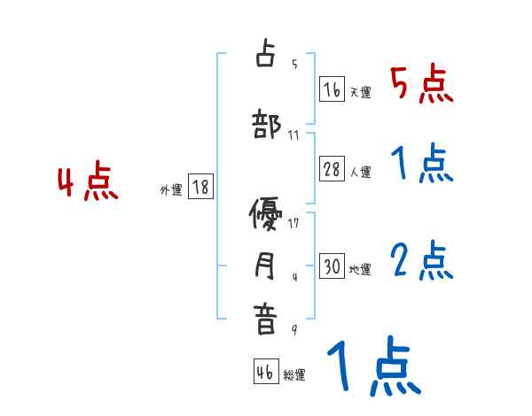 天運![]() | 占部優月音さんの天運は16画の5つ星!人望が厚く大きく発展する。逆転成功が見える。 家系が持つ宿命的な運勢を表します。祖先から受け継いだ苗字ですので自分の力が及びません。家柄を象徴します。 |