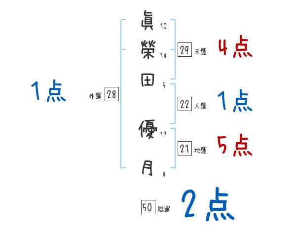 天運![]() | 眞榮田優月さんの天運は29画の4つ星!完全主義で才能がある。厳格な心の持ち主。 家系が持つ宿命的な運勢を表します。祖先から受け継いだ苗字ですので自分の力が及びません。家柄を象徴します。 |