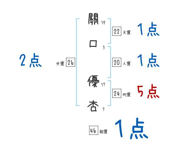 外運![]() | 關口優杏さんの外運は26画の2つ星!波瀾万丈かも。信頼できる人を大事にしましょう。 生活面を象徴する運勢です。外部から受ける影響力を表し、結婚運、家庭運や職場、環境への順応性を表します。 |