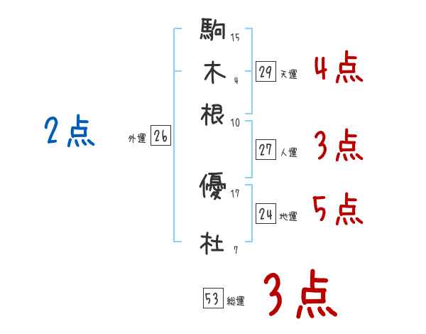 総運![]() | 駒木根優杜さんの総運は53画の3つ星!やや見栄っ張りで虚栄心がある。散財に注意。 あなたの人生を表す1番重要な運勢です。生涯を通じて影響する総合運となり、主に50歳以降の晩年期に影響を及ぼします。 |