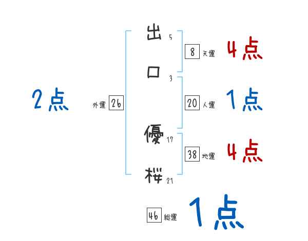 総運![]() | 出口優桜さんの総運は46画の1つ星!迷走することが多く苦労するかも。目先のことにとらわれないように。 あなたの人生を表す1番重要な運勢です。生涯を通じて影響する総合運となり、主に50歳以降の晩年期に影響を及ぼします。 |