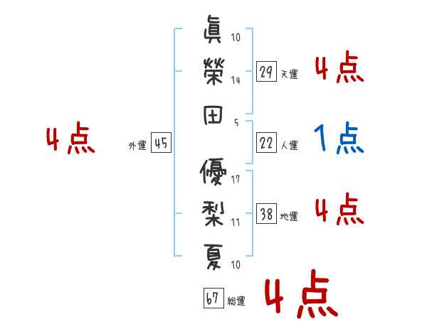 天運![]() | 眞榮田優梨夏さんの天運は29画の4つ星!完全主義で才能がある。厳格な心の持ち主。 家系が持つ宿命的な運勢を表します。祖先から受け継いだ苗字ですので自分の力が及びません。家柄を象徴します。 |