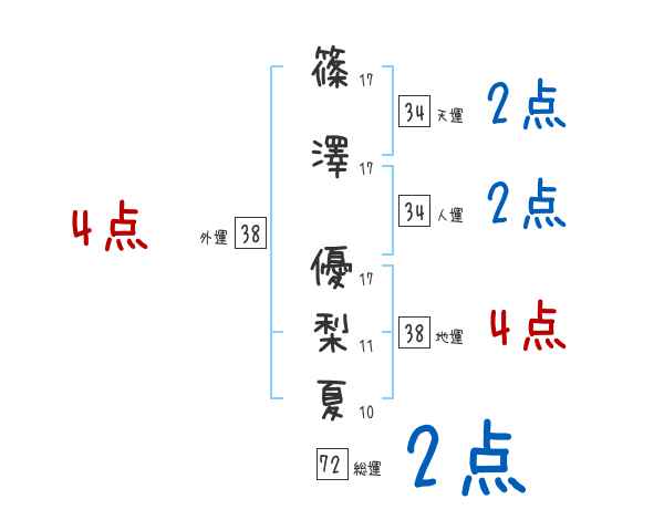 総運![]() | 篠澤優梨夏さんの総運は72画の2つ星!災難が多く不安定な生活にならないように注意。明暗のある人生かも。 あなたの人生を表す1番重要な運勢です。生涯を通じて影響する総合運となり、主に50歳以降の晩年期に影響を及ぼします。 |