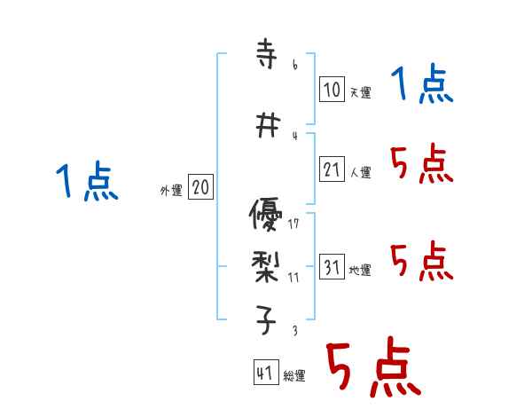 人運![]() | 寺井優梨子さんの人運は21画の5つ星!統率力がある。独立し成功する。名誉を手に入れる。 性格や才能などを表す2番目に重要な運勢です。人間関係や協調性、社会的な成功に影響します。主に20歳から50歳ぐらいまでの中年期の運勢を表します。 |