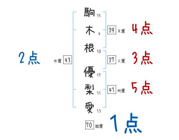 天運![]() | 駒木根優梨愛さんの天運は29画の4つ星!完全主義で才能がある。厳格な心の持ち主。 家系が持つ宿命的な運勢を表します。祖先から受け継いだ苗字ですので自分の力が及びません。家柄を象徴します。 |