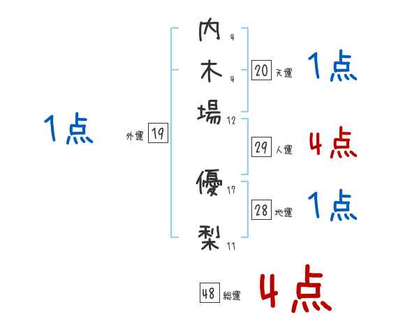 外運![]() | 内木場優梨さんの外運は19画の1つ星!優れた才能を持ちますが、協調性が足りないことも。周りの人と協力する事を意識しましょう。 生活面を象徴する運勢です。外部から受ける影響力を表し、結婚運、家庭運や職場、環境への順応性を表します。 |