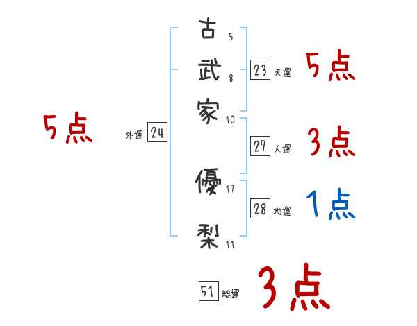 外運![]() | 古武家優梨さんの外運は24画の5つ星!家庭運が良く順調な人生。金運にも恵まれる。 生活面を象徴する運勢です。外部から受ける影響力を表し、結婚運、家庭運や職場、環境への順応性を表します。 |