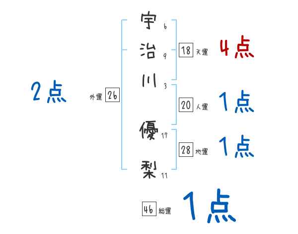 外運![]() | 宇治川優梨さんの外運は26画の2つ星!波瀾万丈かも。信頼できる人を大事にしましょう。 生活面を象徴する運勢です。外部から受ける影響力を表し、結婚運、家庭運や職場、環境への順応性を表します。 |