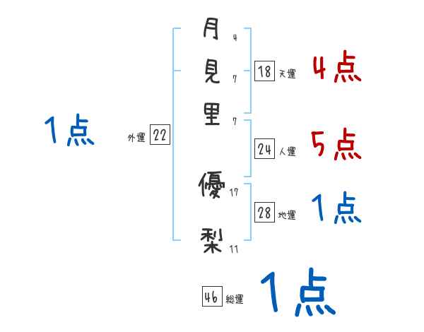 総運![]() | 月見里優梨さんの総運は46画の1つ星!迷走することが多く苦労するかも。目先のことにとらわれないように。 あなたの人生を表す1番重要な運勢です。生涯を通じて影響する総合運となり、主に50歳以降の晩年期に影響を及ぼします。 |