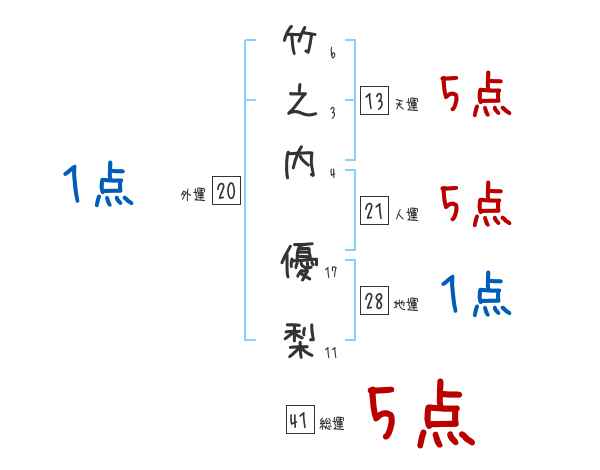 人運![]() | 竹之内優梨さんの人運は21画の5つ星!統率力がある。独立し成功する。名誉を手に入れる。 性格や才能などを表す2番目に重要な運勢です。人間関係や協調性、社会的な成功に影響します。主に20歳から50歳ぐらいまでの中年期の運勢を表します。 |