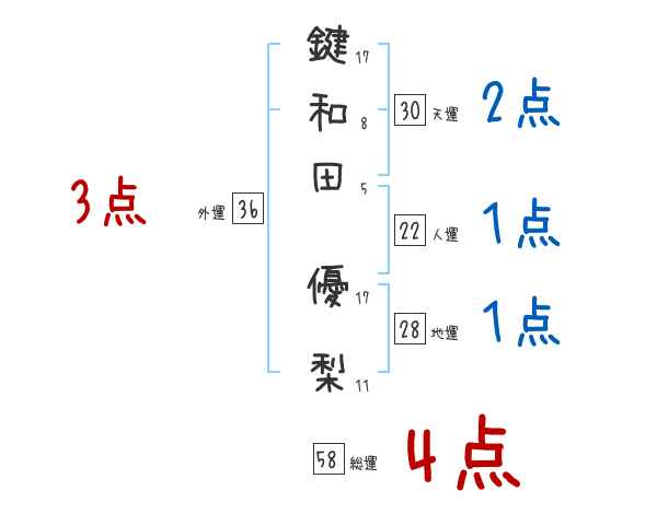 総運![]() | 鍵和田優梨さんの総運は58画の4つ星!安定した生活。大器晩成タイプ。 あなたの人生を表す1番重要な運勢です。生涯を通じて影響する総合運となり、主に50歳以降の晩年期に影響を及ぼします。 |
