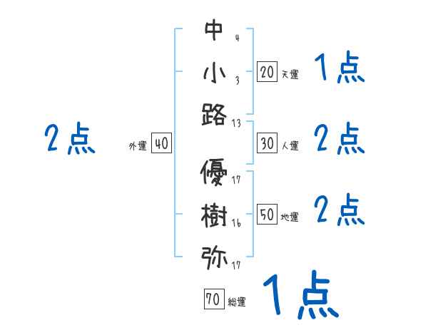 地運![]() | 中小路優樹弥さんの地運は50画の2つ星!浮き沈みが激しく不安定。しりすぼみに衰退しやすいので注意しましょう。 個性を表す基礎的な運勢です。性格形成や対人関係、行動力など家庭環境に影響されます。主に誕生してから20歳くらいまでの若年期の運勢を表します。 |
