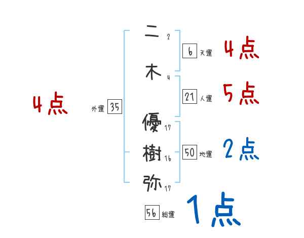 外運![]() | 二木優樹弥さんの外運は35画の4つ星!温厚な性格で感受性が高い。穏和な性格で人望が厚い。 生活面を象徴する運勢です。外部から受ける影響力を表し、結婚運、家庭運や職場、環境への順応性を表します。 |