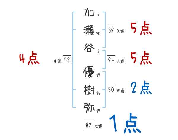 外運![]() | 加瀬谷優樹弥さんの外運は58画の4つ星!安定した生活。大器晩成タイプ。 生活面を象徴する運勢です。外部から受ける影響力を表し、結婚運、家庭運や職場、環境への順応性を表します。 |