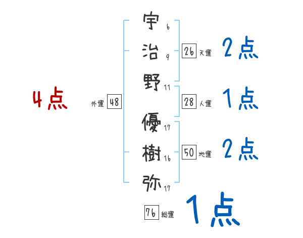 天運![]() | 宇治野優樹弥さんの天運は26画の2つ星!波瀾万丈かも。信頼できる人を大事にしましょう。 家系が持つ宿命的な運勢を表します。祖先から受け継いだ苗字ですので自分の力が及びません。家柄を象徴します。 |