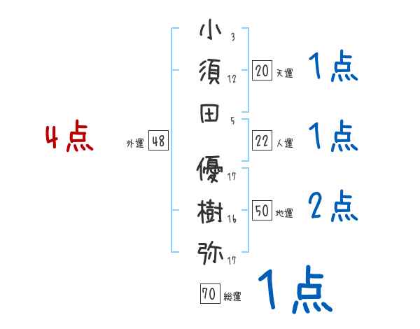外運![]() | 小須田優樹弥さんの外運は48画の4つ星!賢明な性格で人望が厚い。指導力があり多くの人に尊敬される。 生活面を象徴する運勢です。外部から受ける影響力を表し、結婚運、家庭運や職場、環境への順応性を表します。 |