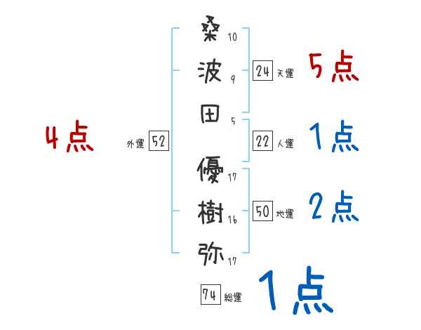 外運![]() | 桑波田優樹弥さんの外運は52画の4つ星!先見性と独創性に優れ考える力がある。強運の持ち主。 生活面を象徴する運勢です。外部から受ける影響力を表し、結婚運、家庭運や職場、環境への順応性を表します。 |