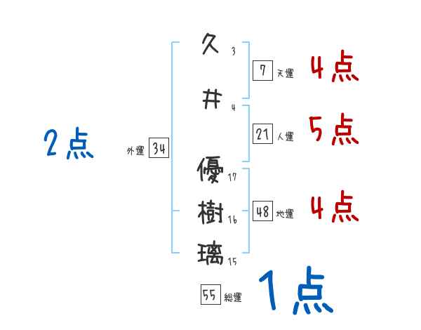 天運![]() | 久井優樹璃さんの天運は7画の4つ星!強い意志や信念を持ち独立心が強い。自立する。 家系が持つ宿命的な運勢を表します。祖先から受け継いだ苗字ですので自分の力が及びません。家柄を象徴します。 |