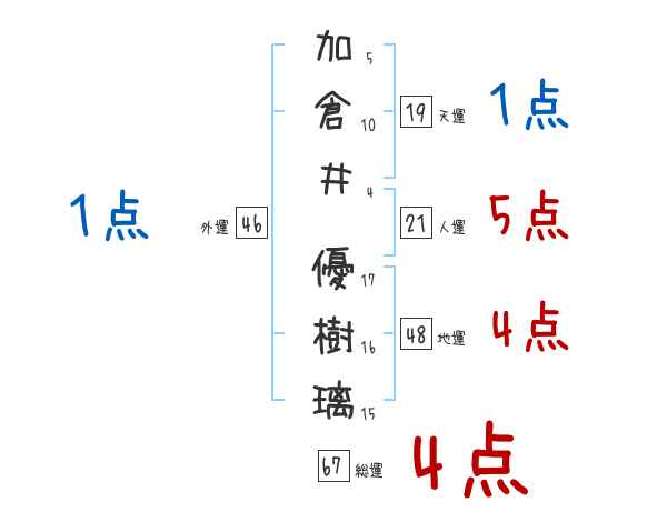 人運![]() | 加倉井優樹璃さんの人運は21画の5つ星!統率力がある。独立し成功する。名誉を手に入れる。 性格や才能などを表す2番目に重要な運勢です。人間関係や協調性、社会的な成功に影響します。主に20歳から50歳ぐらいまでの中年期の運勢を表します。 |
