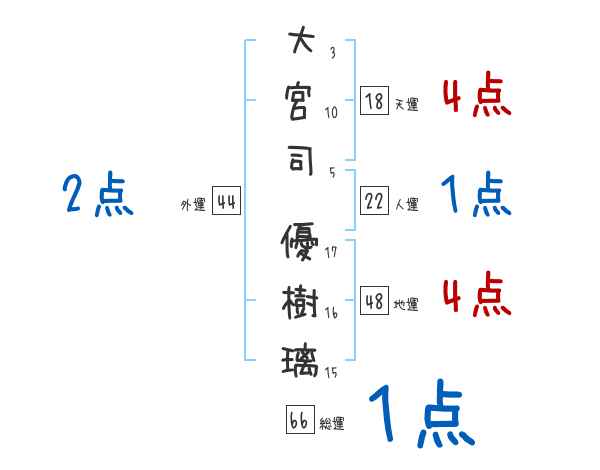 総運![]() | 大宮司優樹璃さんの総運は66画の1つ星!迷うことが多く挫折しやすい傾向が。辛抱強く物事に取り組みましょう。 あなたの人生を表す1番重要な運勢です。生涯を通じて影響する総合運となり、主に50歳以降の晩年期に影響を及ぼします。 |