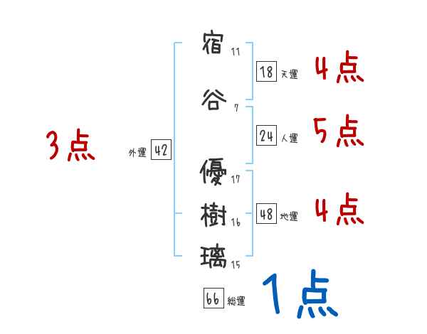 外運![]() | 宿谷優樹璃さんの外運は42画の3つ星!病気に注意。多芸であるが消極的でおとなしい。 生活面を象徴する運勢です。外部から受ける影響力を表し、結婚運、家庭運や職場、環境への順応性を表します。 |
