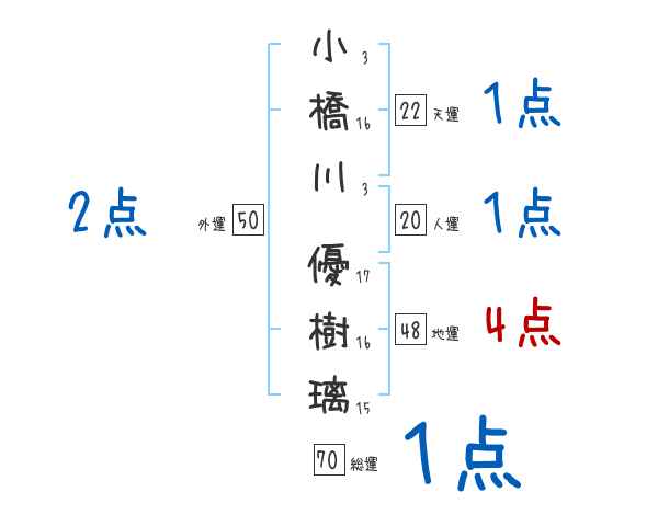 外運![]() | 小橋川優樹璃さんの外運は50画の2つ星!浮き沈みが激しく不安定。しりすぼみに衰退しやすいので注意しましょう。 生活面を象徴する運勢です。外部から受ける影響力を表し、結婚運、家庭運や職場、環境への順応性を表します。 |