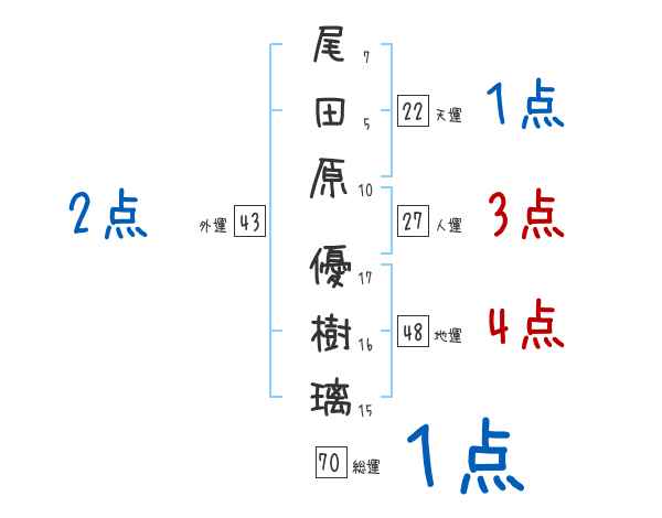 外運![]() | 尾田原優樹璃さんの外運は43画の2つ星!頑固な性格で独立心が強いかも。やや非現実的で浪費に注意しましょう。 生活面を象徴する運勢です。外部から受ける影響力を表し、結婚運、家庭運や職場、環境への順応性を表します。 |