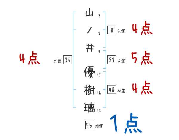 人運![]() | 山ノ井優樹璃さんの人運は21画の5つ星!統率力がある。独立し成功する。名誉を手に入れる。 性格や才能などを表す2番目に重要な運勢です。人間関係や協調性、社会的な成功に影響します。主に20歳から50歳ぐらいまでの中年期の運勢を表します。 |