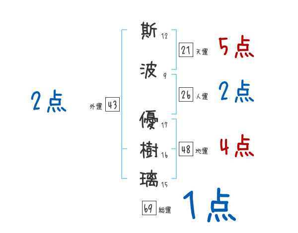 天運![]() | 斯波優樹璃さんの天運は21画の5つ星!統率力がある。独立し成功する。名誉を手に入れる。 家系が持つ宿命的な運勢を表します。祖先から受け継いだ苗字ですので自分の力が及びません。家柄を象徴します。 |