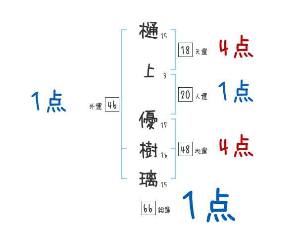 天運![]() | 樋上優樹璃さんの天運は18画の4つ星!情熱的で剛気。忍耐力があり信頼される。 家系が持つ宿命的な運勢を表します。祖先から受け継いだ苗字ですので自分の力が及びません。家柄を象徴します。 |