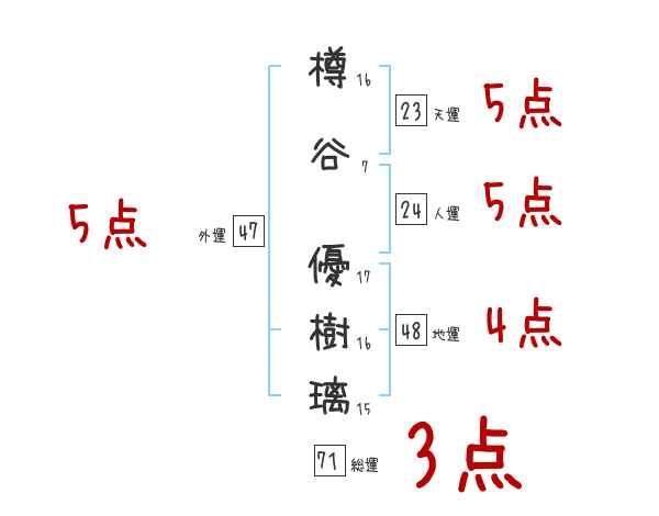 外運![]() | 樽谷優樹璃さんの外運は47画の5つ星!実力が開花し発展する円満な人生。財に恵まれる。 生活面を象徴する運勢です。外部から受ける影響力を表し、結婚運、家庭運や職場、環境への順応性を表します。 |