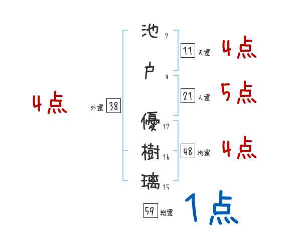 外運![]() | 池戸優樹璃さんの外運は38画の4つ星!温厚な性格で技術的な才能を発揮する。職人的な仕事に向いている。 生活面を象徴する運勢です。外部から受ける影響力を表し、結婚運、家庭運や職場、環境への順応性を表します。 |