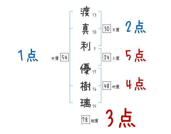 外運![]() | 渡真利優樹璃さんの外運は54画の1つ星!トラブルが多いかも。周りをよく見て協調して過ごしましょう。 生活面を象徴する運勢です。外部から受ける影響力を表し、結婚運、家庭運や職場、環境への順応性を表します。 |