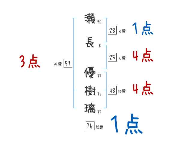 天運![]() | 瀬長優樹璃さんの天運は28画の1つ星!家庭環境に注意。スポーツで活躍できる能力があるかも。 家系が持つ宿命的な運勢を表します。祖先から受け継いだ苗字ですので自分の力が及びません。家柄を象徴します。 |
