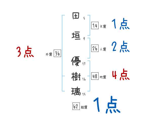 外運![]() | 田垣優樹璃さんの外運は36画の3つ星!先見性が豊かです。多少神経質で苦労することも。 生活面を象徴する運勢です。外部から受ける影響力を表し、結婚運、家庭運や職場、環境への順応性を表します。 |