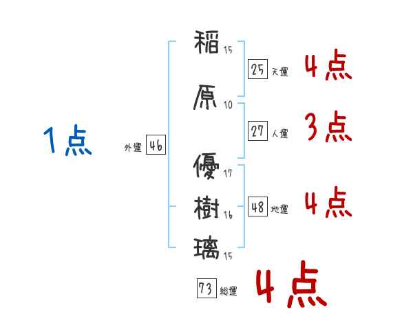 天運![]() | 稲原優樹璃さんの天運は25画の4つ星!個性があり才能があふれる。強運の持ち主で発展する。 家系が持つ宿命的な運勢を表します。祖先から受け継いだ苗字ですので自分の力が及びません。家柄を象徴します。 |