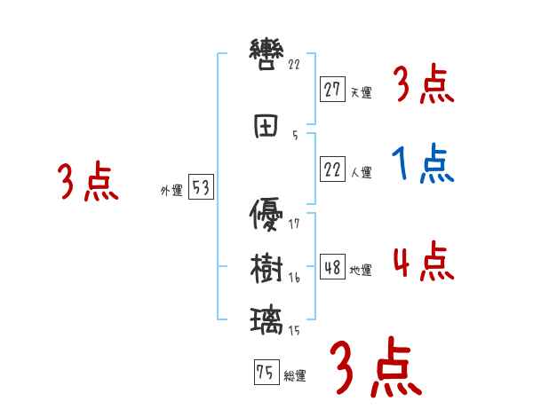 外運![]() | 轡田優樹璃さんの外運は53画の3つ星!やや見栄っ張りで虚栄心がある。散財に注意。 生活面を象徴する運勢です。外部から受ける影響力を表し、結婚運、家庭運や職場、環境への順応性を表します。 |