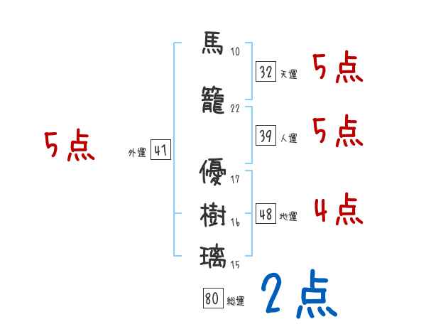 天運![]() | 馬籠優樹璃さんの天運は32画の5つ星!柔軟性があり成功する。チャンスが多く金運が良い。 家系が持つ宿命的な運勢を表します。祖先から受け継いだ苗字ですので自分の力が及びません。家柄を象徴します。 |