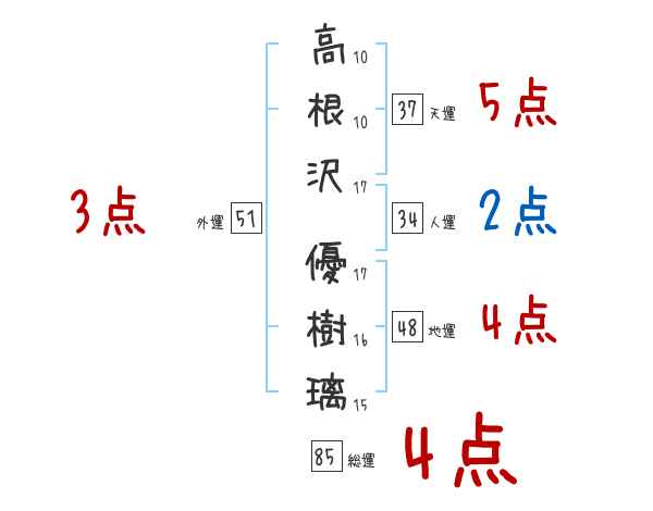 外運![]() | 高根沢優樹璃さんの外運は51画の3つ星!変化が激しく、危険に注意。堅実な性格。 生活面を象徴する運勢です。外部から受ける影響力を表し、結婚運、家庭運や職場、環境への順応性を表します。 |