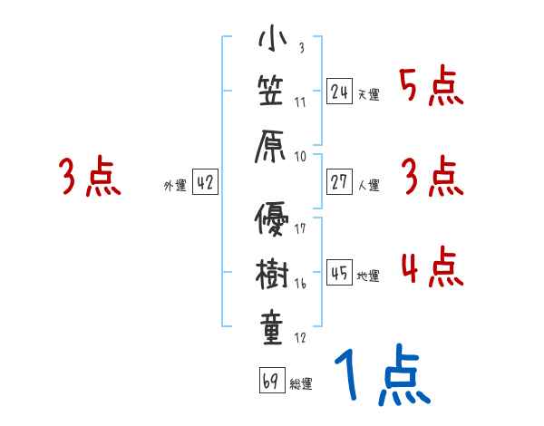 天運![]() | 小笠原優樹童さんの天運は24画の5つ星!家庭運が良く順調な人生。金運にも恵まれる。 家系が持つ宿命的な運勢を表します。祖先から受け継いだ苗字ですので自分の力が及びません。家柄を象徴します。 |