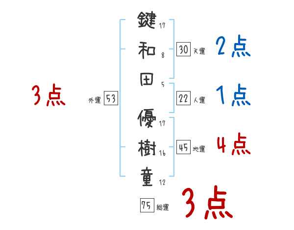 天運![]() | 鍵和田優樹童さんの天運は30画の2つ星!浮き沈みの激しさに注意しましょう。 家系が持つ宿命的な運勢を表します。祖先から受け継いだ苗字ですので自分の力が及びません。家柄を象徴します。 |
