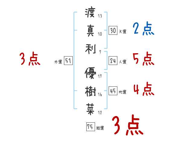 人運![]() | 渡真利優樹菜さんの人運は24画の5つ星!家庭運が良く順調な人生。金運にも恵まれる。 性格や才能などを表す2番目に重要な運勢です。人間関係や協調性、社会的な成功に影響します。主に20歳から50歳ぐらいまでの中年期の運勢を表します。 |