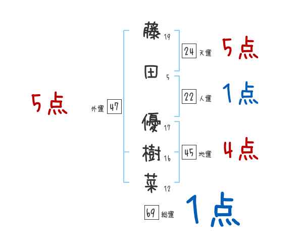 天運![]() | 藤田優樹菜さんの天運は24画の5つ星!家庭運が良く順調な人生。金運にも恵まれる。 家系が持つ宿命的な運勢を表します。祖先から受け継いだ苗字ですので自分の力が及びません。家柄を象徴します。 |