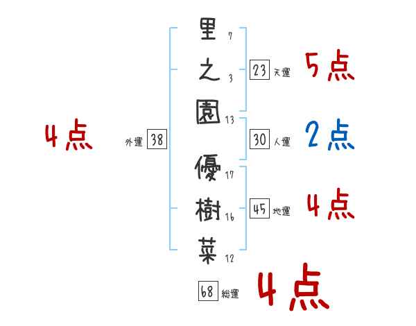 天運![]() | 里之園優樹菜さんの天運は23画の5つ星!想像力に優れ活力がある。一代で成功し名誉を手に入れる。 家系が持つ宿命的な運勢を表します。祖先から受け継いだ苗字ですので自分の力が及びません。家柄を象徴します。 |