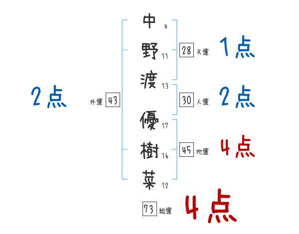 天運![]() | 中野渡優樹菜さんの天運は28画の1つ星!家庭環境に注意。スポーツで活躍できる能力があるかも。 家系が持つ宿命的な運勢を表します。祖先から受け継いだ苗字ですので自分の力が及びません。家柄を象徴します。 |