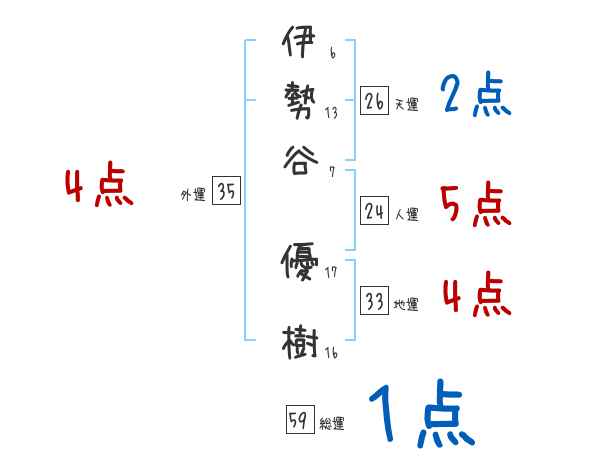 天運![]() | 伊勢谷優樹さんの天運は26画の2つ星!波瀾万丈かも。信頼できる人を大事にしましょう。 家系が持つ宿命的な運勢を表します。祖先から受け継いだ苗字ですので自分の力が及びません。家柄を象徴します。 |