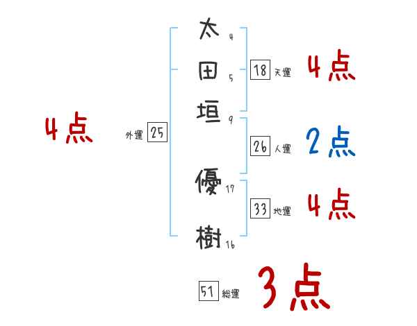天運![]() | 太田垣優樹さんの天運は18画の4つ星!情熱的で剛気。忍耐力があり信頼される。 家系が持つ宿命的な運勢を表します。祖先から受け継いだ苗字ですので自分の力が及びません。家柄を象徴します。 |