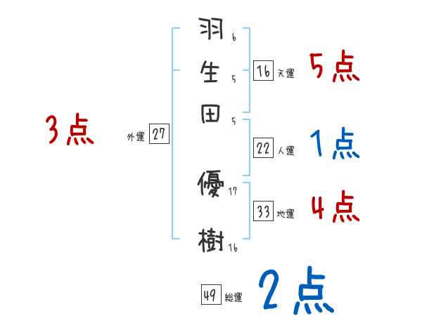 天運![]() | 羽生田優樹さんの天運は16画の5つ星!人望が厚く大きく発展する。逆転成功が見える。 家系が持つ宿命的な運勢を表します。祖先から受け継いだ苗字ですので自分の力が及びません。家柄を象徴します。 |